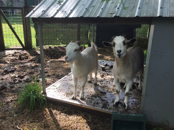 Two cute, white goats seem to pose for a photo outside their little roofed pen.
