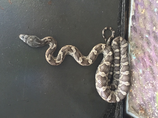 There is a tan and brown snake who's body is mostly pushed against a wall and his head is slithering outwards from the wall.