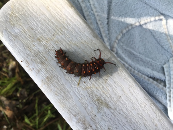 Picture of a long orange and brown bug with many legs on the arm of a chair.