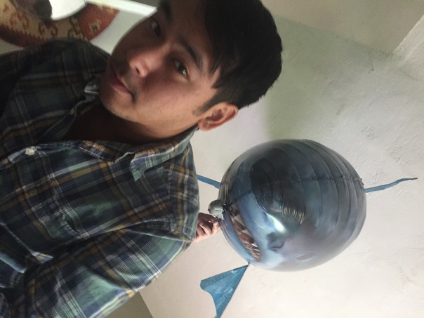 There is an inflatable shark behind a man wearing a plaid shirt in a white room.