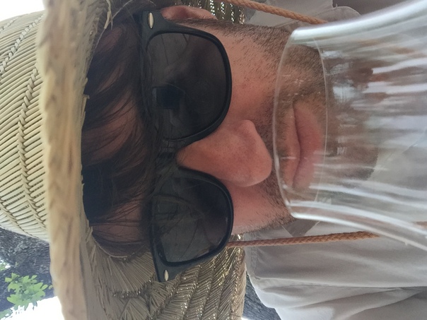 This man is a straw hat and dark sunglasses is enjoying a drink.