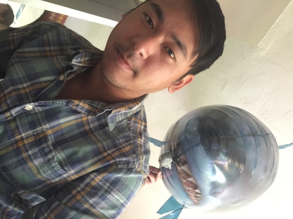 A young asian man smiles faintly at the camera while an unknown person behind him holds a great white shark balloon above his left shoulder.
