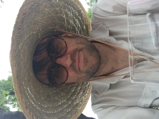The photo is turned 90 degree degrees counterclockwise, and shows a middle-aged man with a five o'clock shadow and brown hair, wearing sunglasses, a straw hat, and a white button-up shirt.