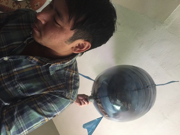 A large glass orb behind a young Asian man.