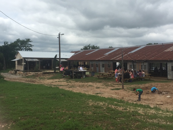 groups of people sitting at a picnic table in front of stables