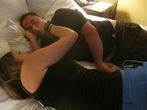 There is a woman who is awake and a man who is asleep lying side by side in bed. |