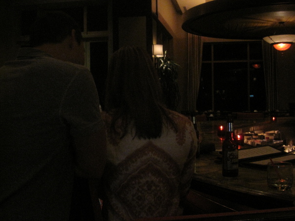 A dark photograph of a man and woman facing away from the camera in a very romantic setting. |