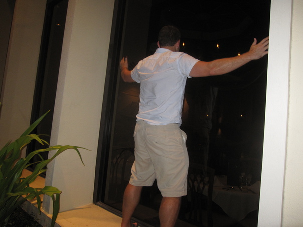 A man with a white shirt and cream shorts is standing next to a large window with his arms spread out. |