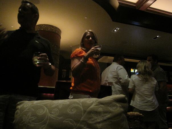 Underexposed picture of a party where people are holding cocktails. Among them is a woman in an orange shirt looking at the camera from behind a seat. |