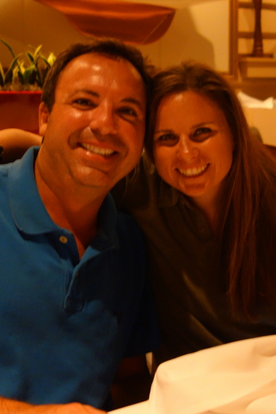 A dark haired couple sits close together at a white-table clothed table and smiles for a picture. |