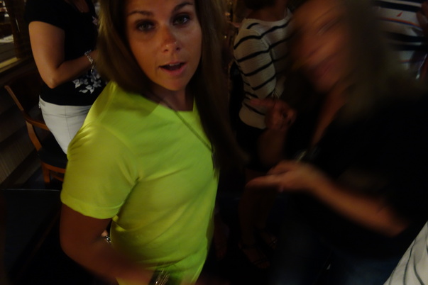 A young woman in a neon green t-shirt is caught off guard in this candid snapshot. |
