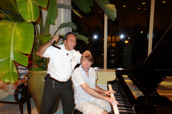 Can't tell if that man is stapling the guy playing the piano our holding a beer opener... |