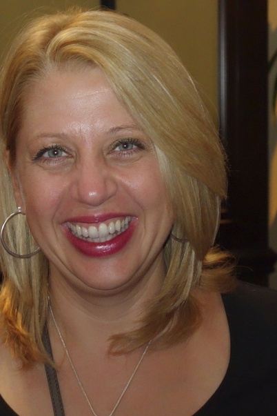 This is a picture of a happy blonde woman, smiling and wearing a black shirt. |