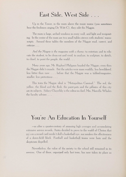 A paper extracted from a book with two main headings "East side, West side.." and "You're an education in yourself"