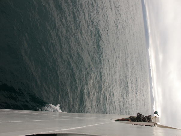 A blue-gray ocean with foggy gray mountains and clouds in the distance, taken from the side of a ship.