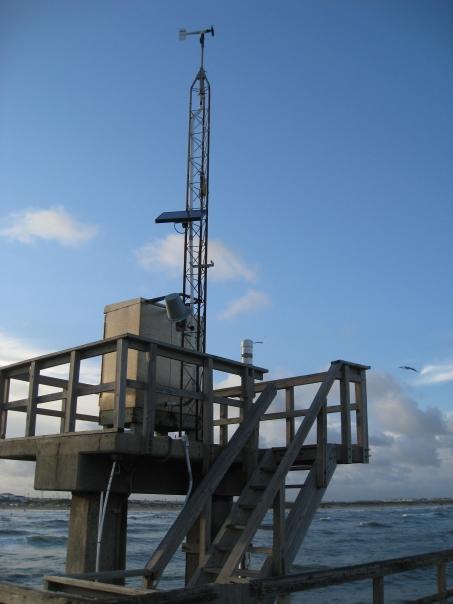 An oceanic device on a pier to detect the wind over the ocean.