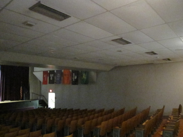 A theater full of chairs with 6 multicolored flags hanging up.
