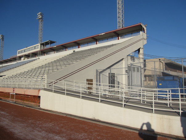 Inside view of a small stadium with chairs for audience.