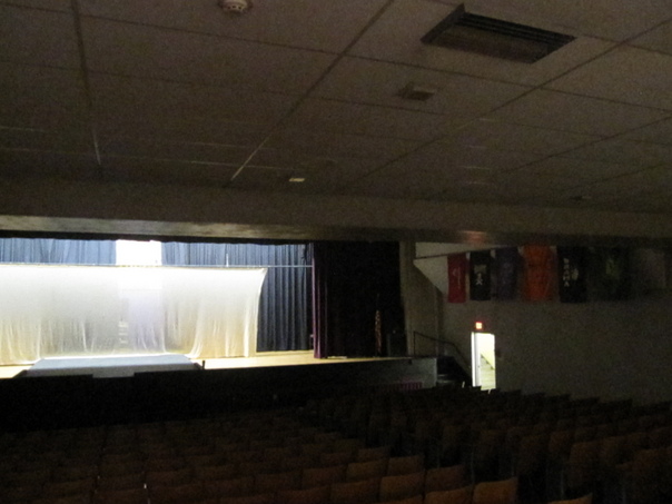 It is a auditorium where the screen is closed because there are plays and there is a exit doorway.