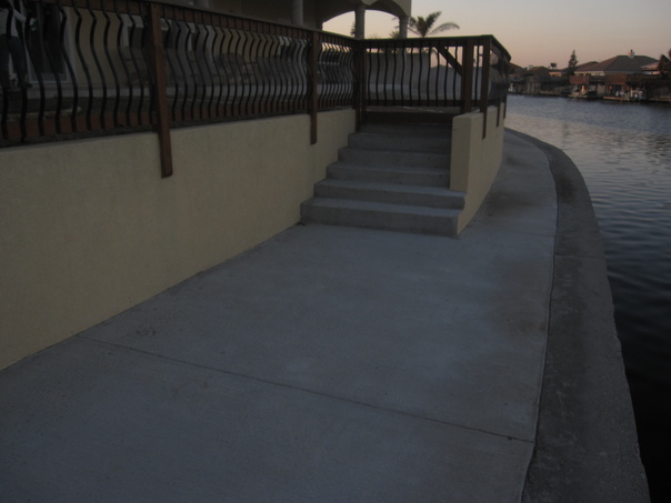 There is a steps near the balustrade. A river passes away the house.