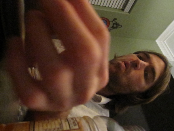 A close up photo of a man with hands very close to camera.