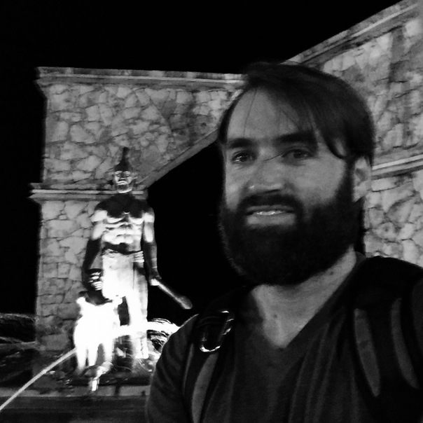 A bearded man on vacation poses for a picture in front of an ancient Asian statue at a historical site.