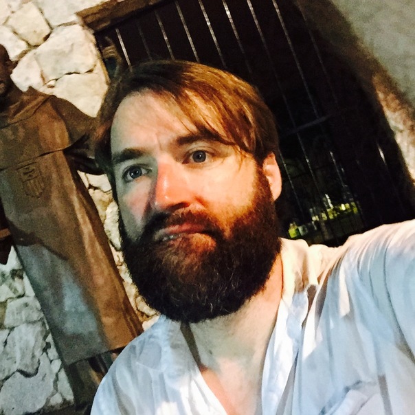 The man has a beard that is brown in color and is wearing a shirt that is white in color.
