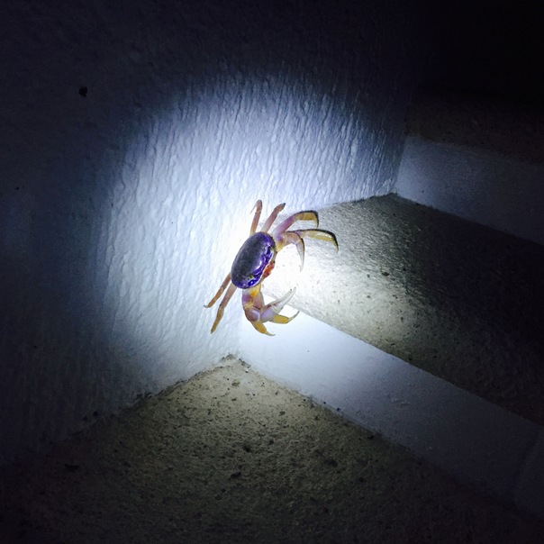 A large crab with orange pincers and a neon blue top, caught by a flashlight on concrete, white stair-steps.
