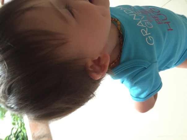 There is a baby wearing a nice blue shirt that says the word hug on it.