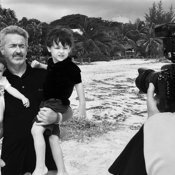 A grey-haired man in a black polo shirt is holding two kids on a tropical beach while a photographer takes their picture.