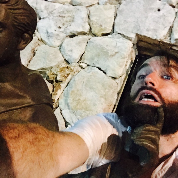 There is a man with a dark beard and dark hair that is holding a mirror and looking at himself