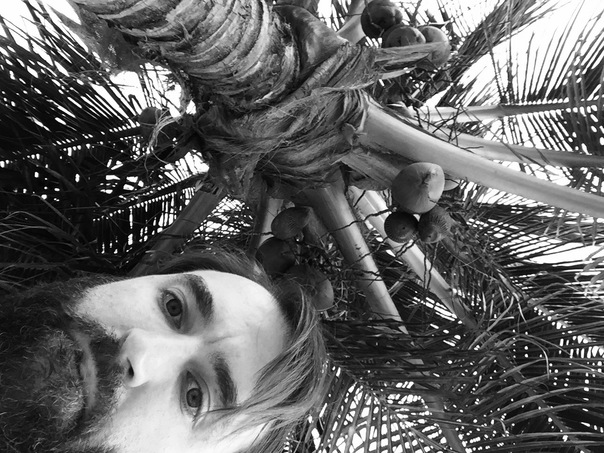 A bearded man stares into the camera while he sits under a palm tree in a tropical location.
