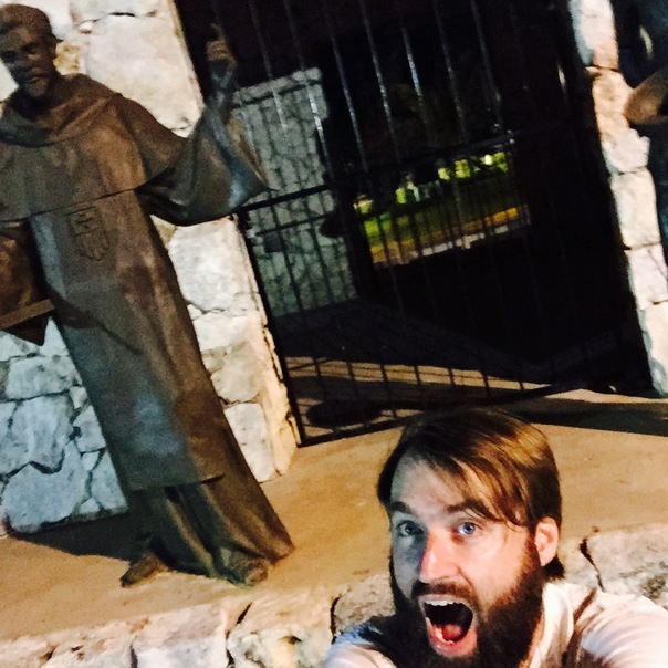 A bearded man takes a selfie in from of an old statue.