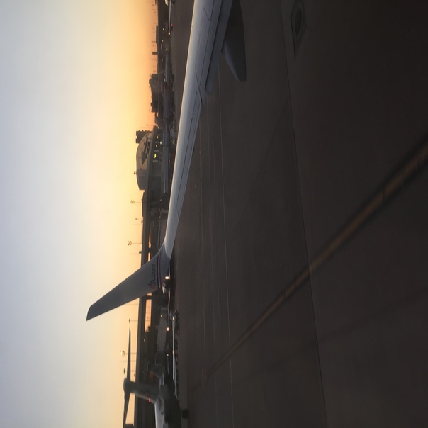 View of the wing of a plane taken from the rear of the plane at dusk on a tarmac.