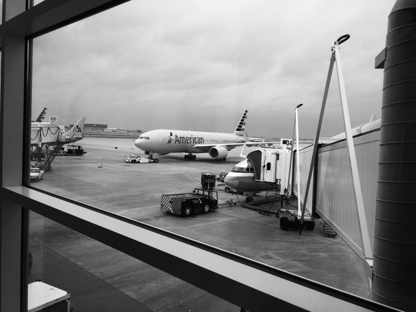 A black and white picture taken from inside an airport outside of planes sitting on the tarmac.