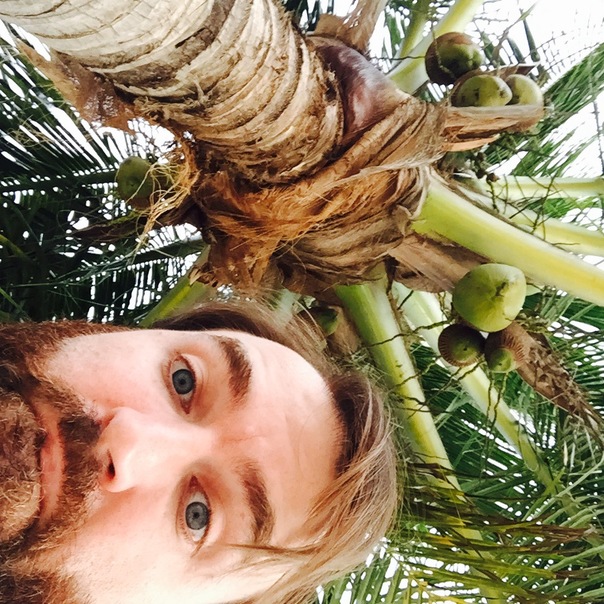The man posed for a picture in front of the cocanut tree