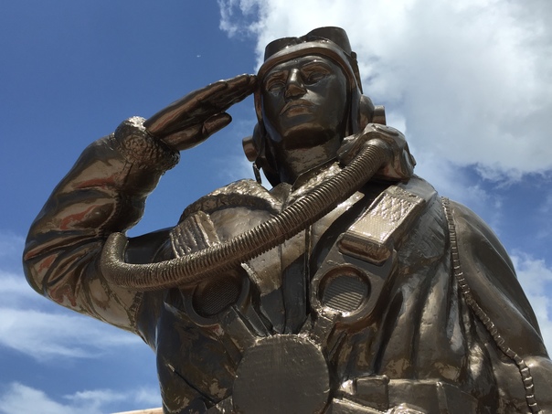 a golden brown statue of a pilot saluting with a beautiful blue sky in the background.