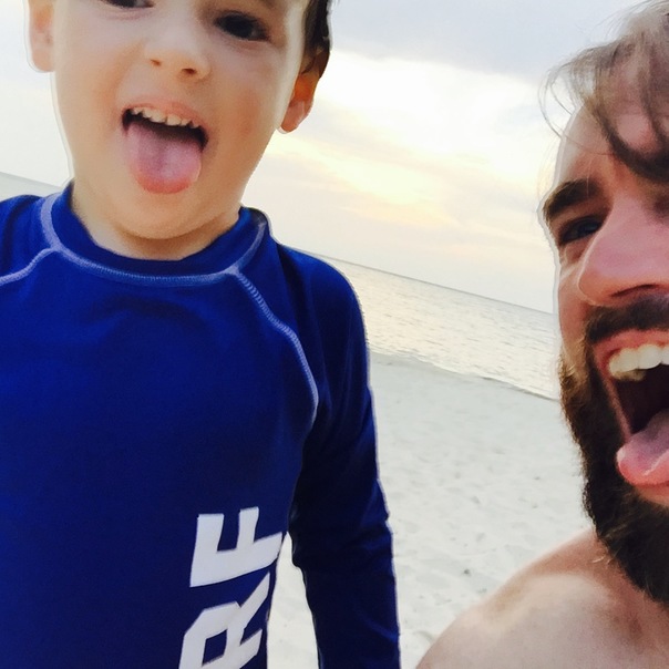 A beard man and a kid are making faces for taking a photo