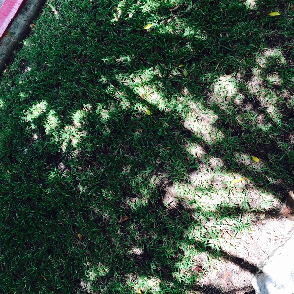 Photo shows the leaves of a tree distorting the sunlight on the ground below towards the green grass.
