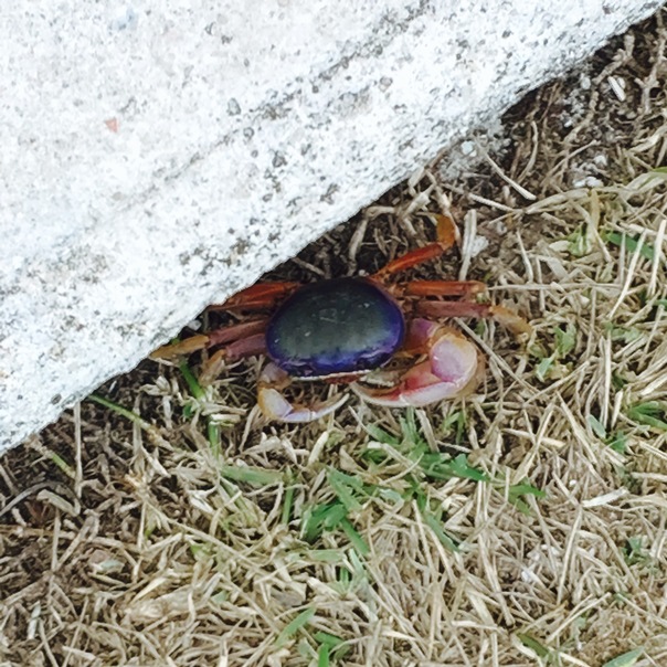 A blue and red crab crawling onto tan and green grass.