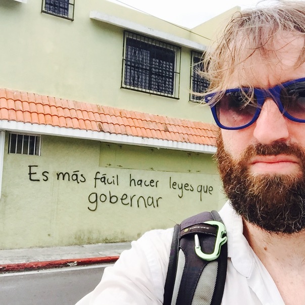 A man with blue glasses is standing near a wall with words written on it.