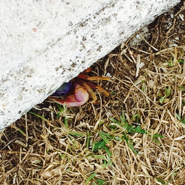 A crab hiding under a paved cement sidewalk while standing on dry grass.