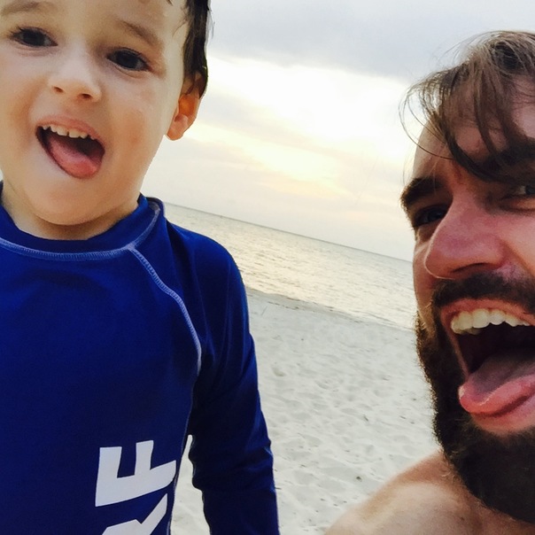 A child with a blue swim shirt is on a beach with a man with a beard and mustache and both the child and the man are sticking out their tongues.