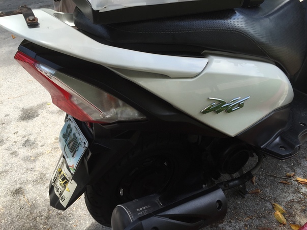 The back end of a parked motorcycle with it's license plate showing.