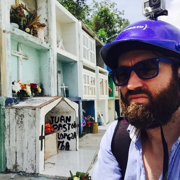a man with a great beard wearing a blue helmet in the background walls with large writing on them.