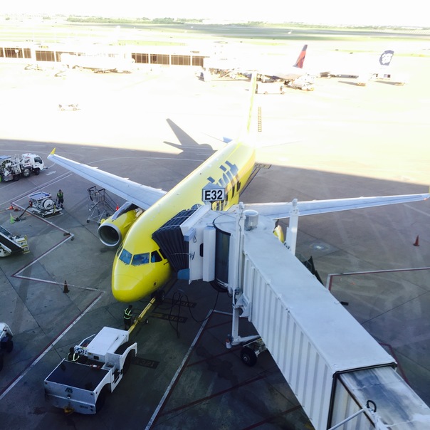 a yellow jet sits parked at the terminal with maintenance men hooking up a device to the bottom.