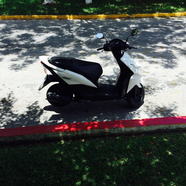 A black and white small moped parked on a street with a red stripe painted on one side and a yellow painted curb on the other.