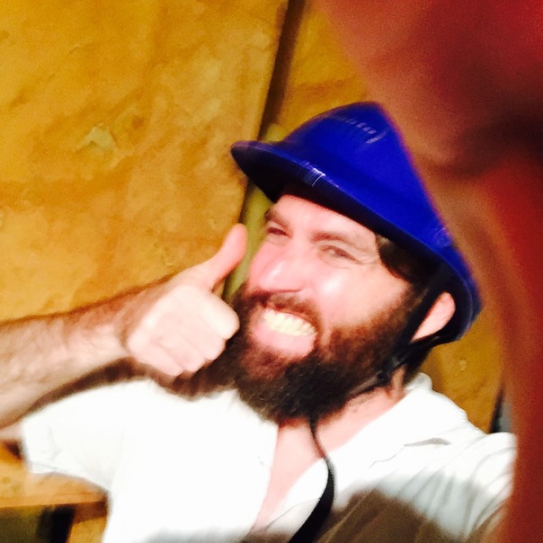 A man wearing a rock climbing helmet is being held up by a rope while giving a thumbs up.