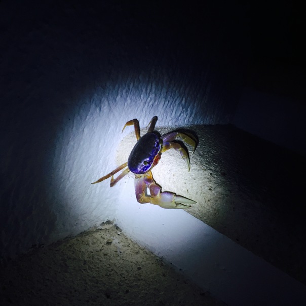 If it was not for her steady flashlight, the young girl would have stepped directly on the large, blue topped crab.