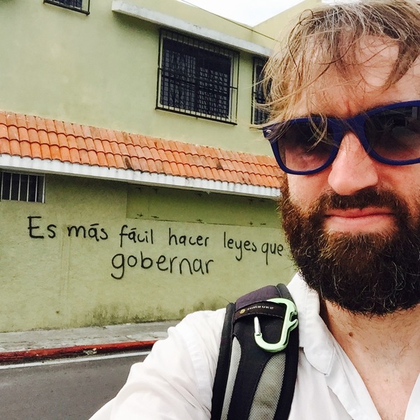 A bearded man in sunglasses poses in front of a wall marked with Spanish graffiti.